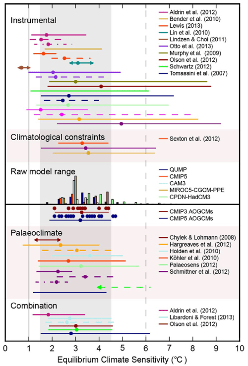 Het instrumentele tijdperk is maar één bewijscategorie, er zijn nog andere. Een daarvan zijn de klimaatmodellen, de CMIP5 modellen die gebruikt zijn voor het nieuwe vijfde IPCC rapport. Deze modellen geven een Equilibrium Climate Sensitivity van 3.22 °C ± 1.32 °C (90%).