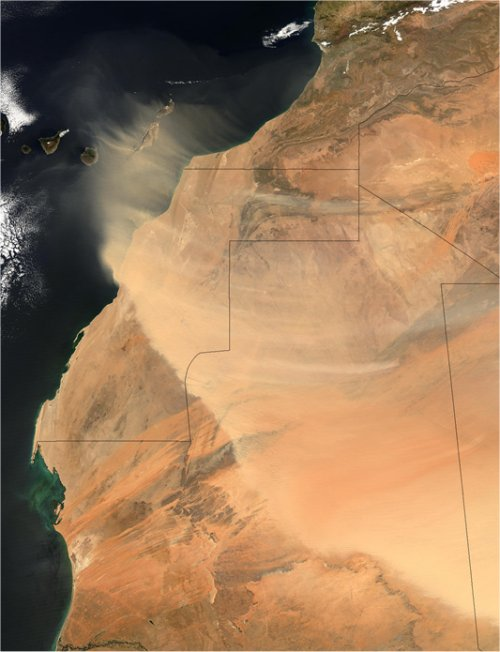 © NASA – The Visible Earth. Jacques Descloitres, MODIS Rapid Response Team, NASA/GSFC. Enorme hoeveelheden stof worden uit de Sahara de lucht in geblazen, zoals op deze satellietfoto te zien is.