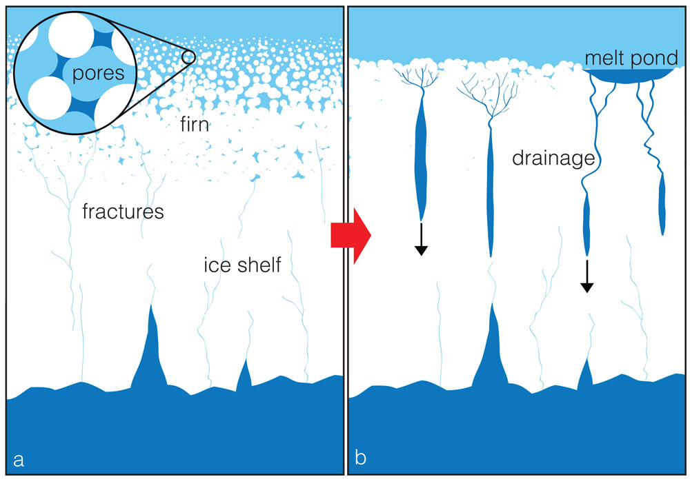 Sneeuw die op gletsjers of op ijsplaten valt, wordt samengedrukt tot ijs onder zijn eigen gewicht. Voordat sneeuw ijs is noemen we het firn. De firnlaag kan smeltwater absorberen, net als een spons. Zolang er voldoende firn is, kan al het smeltwater opgenomen worden en later herbevriezen. Maar wanneer de firnlaag verdwijnt vormt het smeltwater de grote meren die de ijsplaat fataal kunnen worden (zie ook onderstaande figuur).