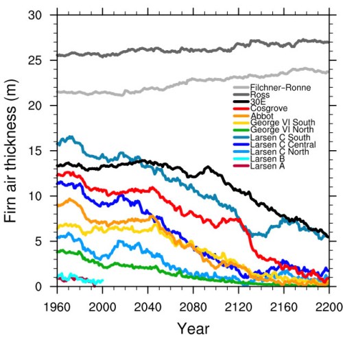 Vervolgens laten we zien dat vooral de ijsplaten rond het Antarctische Schiereiland het de komende eeuwen zwaar te verduren krijgen. Van veel ijsplaten verdwijnt de firnlaag grotendeels of geheel. In Oost-Antarctica is het daarentegen veel kouder, waardoor de hoeveelheid smelt ook de komende twee eeuwen te klein is om de firnlaag weg te smelten. Sterker nog, de firnlaag op de grootste ijsplaten (de Filchner-Ronne en de Ross, beide zo groot als Spanje) wordt alleen maar dikker, doordat de hoeveelheid sneeuwval toeneemt. Die zullen dus naar alle waarschijnlijkheid niet instorten zoals we dat eerder op het Schiereiland hebben gezien.