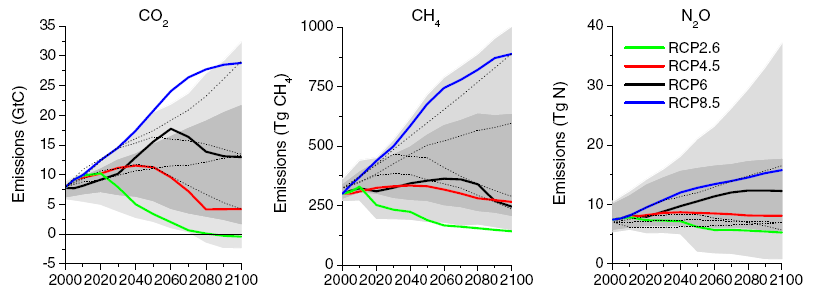 Nog even voor de volledigheid de forceringenen van CO2, CH4 en N2O samen met de RCP scenario’s. CO2 zit relatief laag, CH4 in het midden, en N2O relatief hoog. Merk op dat hoge N2O concentraties ook schadelijk zijn voor de ozonlaag en de vooruitgang in het verminderen van CFK’s teniet kunnen doen.