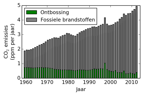 Ter aanvulling om het te verduidelijken voor de lezer: de Global Carbon Project getallen die de 234 Tg C/jaar opleveren (=0.11 ppm CO2 per jaar) betreffen volgens mij de emissies door het verbranden van fossiele brandstoffen en de cement productie.