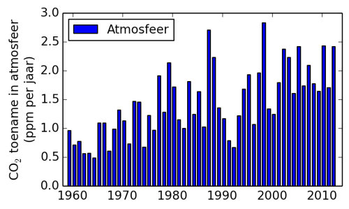 Als deze emissies de enige factor in de zogenaamde koolstofcyclus zouden zijn dan zou je verwachten dat de toename in de atmosfeer gelijk is aan de emissies. Figuur 2 laat zien dat dit niet zo is! Deze atmosferische metingen zijn de best bekende factor in de koolstofcyclus en er vallen meteen twee dingen op. Allereerst is er veel variatie van jaar tot jaar in de toename van CO2, en ten tweede is de toename in de atmosfeer kleiner dan de emissies (vergelijk de waardes op de verticale assen om dit in te zien).