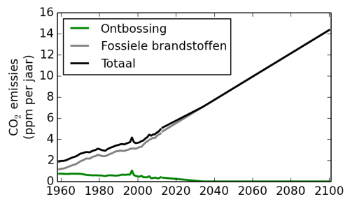 Er liggen enorm veel aannames ten grondslag aan de RCP scenario’s, hier versimpelen we alles en gaan we er van uit dat de trends van de afgelopen 15 jaar door te trekken zijn naar de toekomst. Figuur 4 laat zien hoe de emissies van fossiele brandstoffen dan doorstijgen en verdriedubbelen in 2100 ten opzichte van nu. Emissies van ontbossing nemen af en zouden dan verwaarloosbaar zijn over 20 jaar. Dat betekent overigens niet dat er geen ontbossing meer zou zijn, maar dat er lokaal een balans gevonden kan zijn tussen ontbossing en herbebossing. Bij beide trends kan je uiteraard vraagtekens zetten maar het gaat er hier vooral om wat er zou kunnen gebeuren als we doorgaan op de huidige weg.