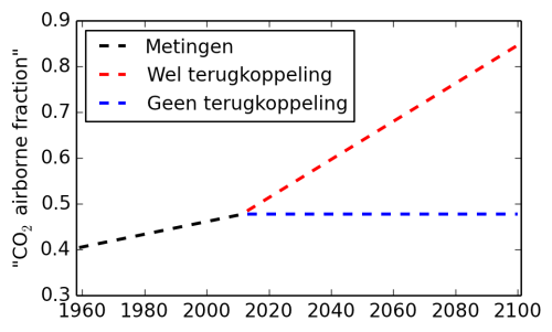 Hier wil ik wat langer bij stilstaan. Niemand weet precies wat de airborne fraction zal doen in de toekomst, en de twee scenario’s zijn vooral bedoeld om aan te geven waarom de klimaat-koolstof terugkoppeling belangrijk is. Modelresultaten liggen ver uit elkaar hoewel ze allemaal hoger dan de blauwe lijn in Figuur 5 zitten, en soms zelfs boven de rode lijn. Ikzelf zou mijn geld ook liever op de rode lijn dan op de blauwe lijn zetten. De reden is simpel: het effect van de factoren die nu voor opname zorgen is niet lineair door te trekken naar de toekomst. Neem CO2 fertilisatie bijvoorbeeld. Tuinders pompen CO2 in de kassen zodat planten sneller groeien. Maar op een gegeven moment maakt extra CO2 niet zo heel veel meer uit o.a. omdat het effect verzadigd of omdat andere factoren limiterend worden. Bomen groeien niet tot aan de hemel. Ook neemt de opname capaciteit van de oceanen af met toenemende concentratie en met toenemende temperatuur.