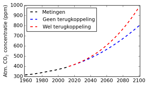 Bij het bekijken van figuur 6 valt op dat jouw ‘wel terugkoppeling’ CO2-concentratie in 2100 rond de 1000 ppm uit zou komen. Dat is iets hoger dan RCP 8.5 dat dan op 900 ppm zit.