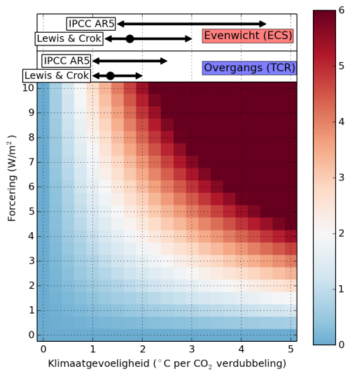 Om toekomstige klimaatverandering te berekenen zijn grofweg 4 factoren van belang: klimaatgevoeligheid, de netto klimaatforcering, de benodigde tijd om een nieuw evenwicht te bereiken, en natuurlijke factoren. De klimaatgevoeligheid heeft de laatste weken veel aandacht gekregen, met name vanwege een rapport van Nic Lewis en Marcel Crok waar een lagere klimaatgevoeligheid uit kwam dan de 1.5-4.5 graden opwarming per CO2 verdubbeling van het laatste IPCC rapport.