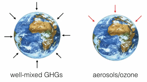 • De verschillende antropogene invloeden die hebben geleid tot een temperatuurstijging sinds de industriële revolutie zijn niet allemaal uniform verdeeld over de aarde. Zo zijn, in tegenstelling tot de homogeen verdeelde broeikasgassen, de concentraties aan aerosolen en ozon voornamelijk gelokaliseerd boven het Noordelijk Halfrond.
