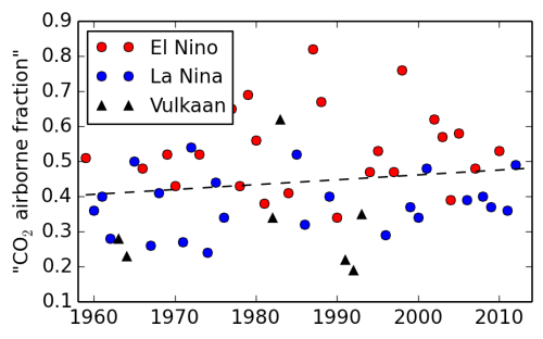 Vroeger was mijn automatische aanname dat de grotere ‘airborne fraction’, en dus geringere CO2-opname, tijdens El Niño jaren wel zou liggen aan de oceaan: in het warmere oppervlaktewater lost er (iets) minder CO2 op.