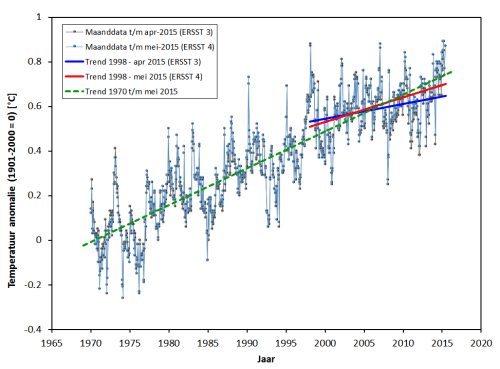 Uit figuur 2 volgt ook dat er wat kleinere verschillen zijn in de data over de afgelopen decennia, met bijvoorbeeld iets meer opwarming (tot circa 0.05 °C) in het laatste decennium bij de nieuwe NCEI data. Bij korte termijn intervallen komen dit soort kleine verschillen direct tot uiting in de trend. Zie figuur 3 voor een verschil in trends van de NCEI dataset t/m april 2015 en t/m mei 2015.