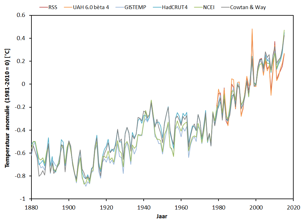 De grafiek in figuur 1 geeft een overzicht van allerlei datasets betreffende de mondiale temperatuur sinds 1880 met daarin twee satelliettemperatuur-datasets en vier oppervlaktetemperatuur-datasets. In die grafiek wordt de periode 1981-2010 als nul weergegeven. Ter indicatie, volgens het WMO is de gemiddelde temperatuur op aarde in de periode 1961-1990 circa 14 °C, daar zitten we nu aan het oppervlak ongeveer 0.7 – 0.8 °C boven.