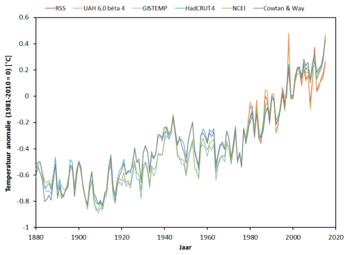 Een aantal zaken kun je uit de grafiek van figuur 1 opmaken. Het is duidelijk warmer geworden op aarde sinds het begin van de 20ste eeuw, ongeveer 1 °C. Ter vergelijking, tijdens de laatste ijstijd was het circa 4 à 5 °C kouder op aarde dan nu, dus 1 °C is een substantieel verschil. De temperatuurwaarden van de satelliet-datasets (oranje en rode lijnen) volgen redelijk de temperatuur van de oppervlakte-datasets (groene, grijze en blauwe lijnen), maar met een grotere variatie. Dat is goed zichtbaar bij bijvoorbeeld 1998, waar het verschil in temperatuur van de twee satelliet-datasets en de vier oppervlakte-datasets meer dan 0.2 °C bedraagt. Wat verder opvalt, is dat na 2005 de temperatuur van de satelliet-datasets een beetje lager ligt dan temperatuur van de oppervlakte-datasets.