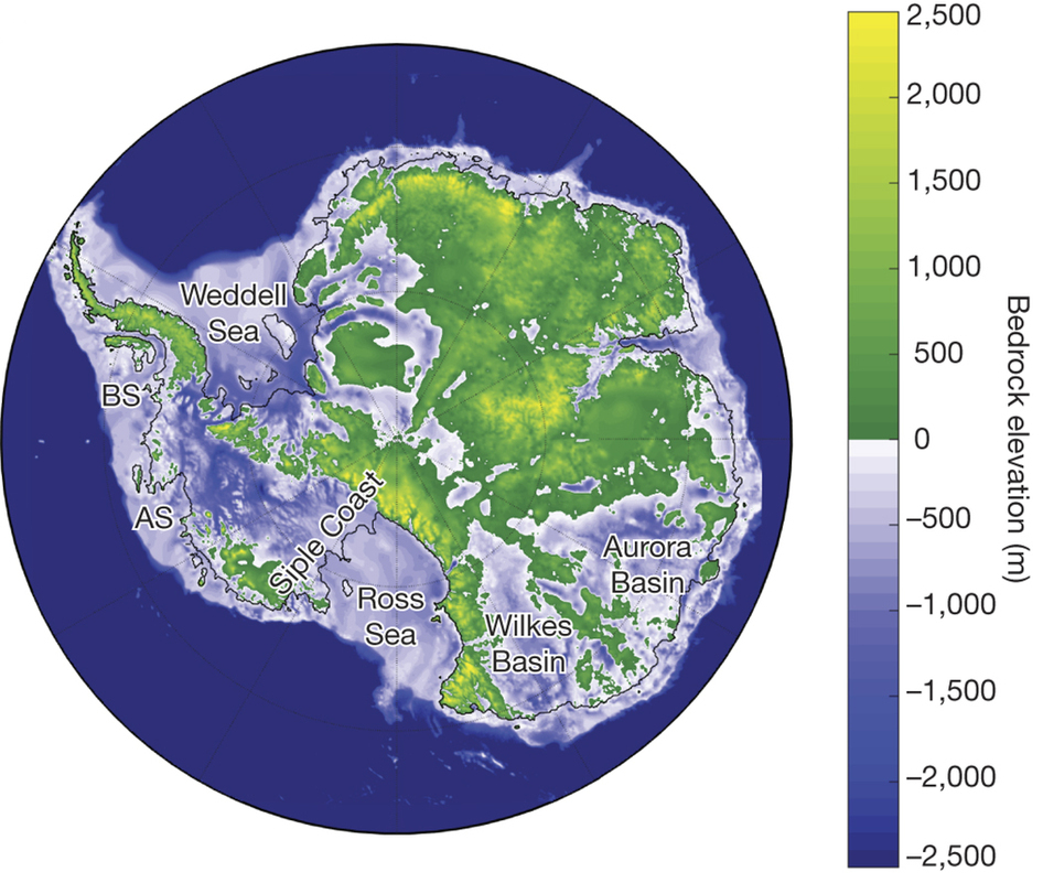 Als afsluiter, om de lezer niet met een al te vervelend gevoel achter te laten, nog een aardig weetje. Eerder had ik het erover dat het ijs op Antarctica niet meteen ophoudt als het onderliggende land tot beneden de zeespiegel daalt. Dat blijkt niet alleen aan de kust van Antarctica te gelden: een behoorlijk deel van het land van Antarctica ligt beneden de zeespiegel. En toch is daar geen oceaan. Vanwege het ijs.