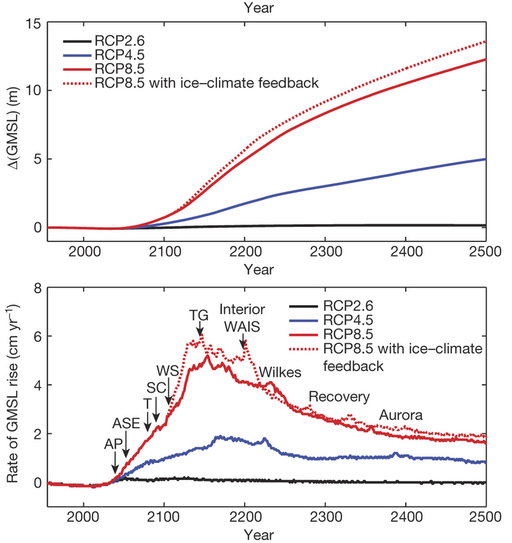De afbeelding hieronder laat de bijdrage van Antarctica aan de zeespiegelstijging en de snelheid van zeespiegelstijging zien die DeConto en Pollard berekenen voor de komende vijf eeuwen voor drie verschillende RCP emissiescenario’s. Het slechte nieuws: meerdere meters zeespiegelstijging per eeuw is een reële mogelijkheid. Het minder slechte nieuws: het duurt hoogstwaarschijnlijk nog wel even totdat het zo ver is. Het goede nieuws: we kunnen het waarschijnlijk nog voorkomen.