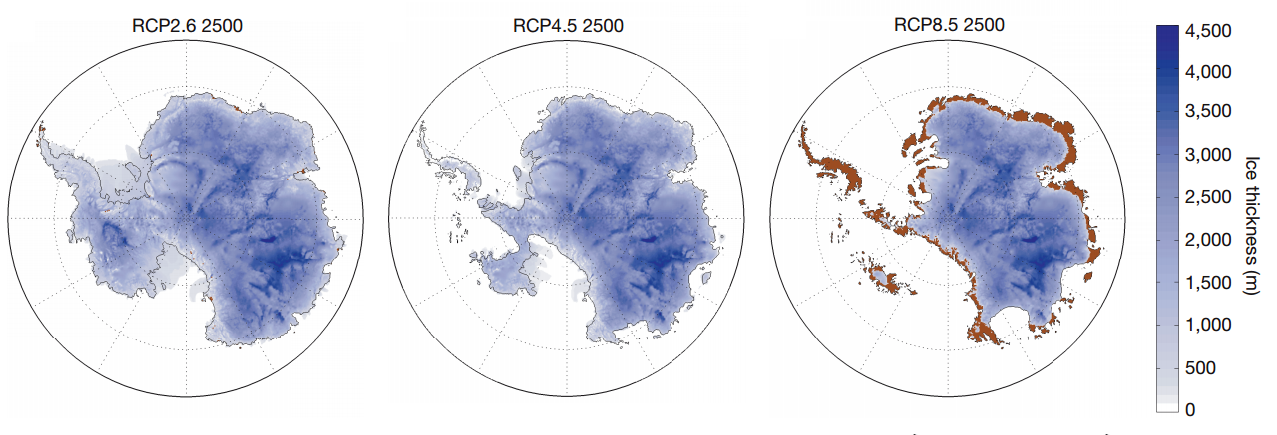 DeConto en Pollard laten ook zien wat er volgens hun berekeningen in het jaar 2500 overblijft van het ijs op Antarctica bij de drie scenario’s.