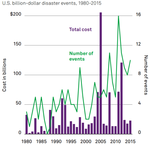 Dit betreft de bovengenoemde gevolgen, zoals bijvoorbeeld een toenemende frequentie en/of intensiteit van stormen, overstromingen, droogteperiodes en bosbranden en tevens de toenemende temperatuur en de zeespiegelstijging. Dat alles brengt risico’s met zich mee voor de waarde van onroerend goed langs de kust en voor landbouw en bedrijven geplaatst in geografisch kwetsbare gebieden. Volgens het rapport is de economische groei in Amerikaanse staten die geraakt worden door extreem weer 10% tot 15% lager dan gebruikelijk in de maand waarin zo’n extreme weergebeurtenis plaatsvindt en blijft zelfs nog tot een jaar lang lager dan verwacht. Daarnaast verwijst men naar een studie die aangeeft dat de menselijke productiviteit afneemt bij toenemende temperaturen. Dat extreme weergebeurtenissen in de papieren kunnen lopen laat men in het rapport o.a. zien via de grafiek in figuur 1.
