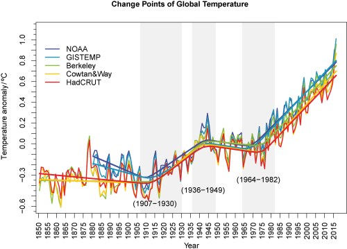 De grafiek uit het artikel laat zien waar er, volgens statistische trendbreukanalyse, werkelijk veranderingen zijn in de trend van de mondiale temperatuur. Met een trendbreukanalyse probeert men de best mogelijke combinatie van lineaire fits voor de data te vinden, waarbij de verschillende trends geen discontinuïteit mogen vertonen. De conclusie is duidelijk: de “hiatus”, waar de afgelopen jaren zoveel over gezegd en geschreven is, wijst niet op een vertraging in het tempo van de opwarming van de aarde. Ofwel: de zogenaamde hiatus was een heel normaal gevolg van natuurlijke variabiliteit van het klimaat. En, aan de andere kant, de drie recente recordwarme jaren wijzen niet op een versnelling. De adder onder het gras: een eventuele versnelling of vertraging is pas na lange tijd met enige mate van zekerheid aan te tonen.