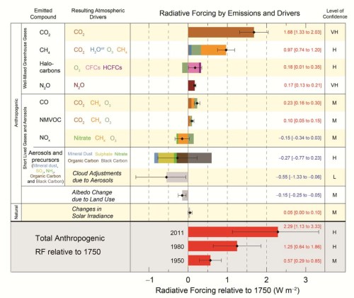 Het tweede image in het blogstuk laat direct zien dat je “ik denk” simpelweg onjuist is. Hieronder de radiatieve forcering over 1750-2011 (IPCC AR5 Fig 8.16), de (positieve) bijdrage van broeikasgassen wordt groter ingeschat dan de (negatieve) bijdrage van aerosolen. Als je betere gegevens hebt, geef een referentie.
