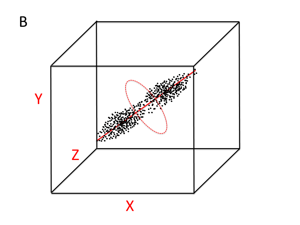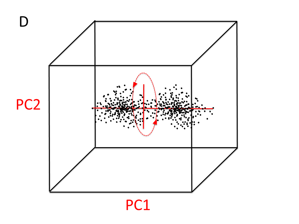 In 3D kan je je de procedure om de PCA uit te voeren nog net voorstellen. Stel dat de puntenwolk de vorm heeft van een streng van twee verse worstjes die een beetje platgedrukt zijn zodat het twee dikke pannenkoekjes zijn geworden die in de ruimte hangen met de zijkant van de pannenkoekjes naar ons toe, en dan schuin omhoog de ruimte in (figuur B). Pak deze hele puntenwolk in gedachten vast en draai net zo lang totdat de grootste variatie in de wolk (van de voorkant tot de achterkant van de streng platte worstjes) parallel aan de X as loopt (figuur C). De x-as is nu principale component 1 (PC1).