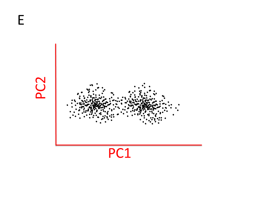 Door nu een scatterplot van PC1 en PC2 tekenen (figuur E) kunnen we de maximale variatie in de eerste 3 variabelen weergegeven in een 2-dimensionaal plaatje. Inderdaad, datareductie! We hebben een dimensie minder nodig. Dat gaat dan wel ten koste van informatie over de dikte van de pannenkoekjes. Die (relatief geringe) variatie is nu niet meer uit de figuur af te lezen. Vaak kan deze reductie nog veel groter zijn, en zullen de eerste twee PCs het merendeel van de variatie weergeven.