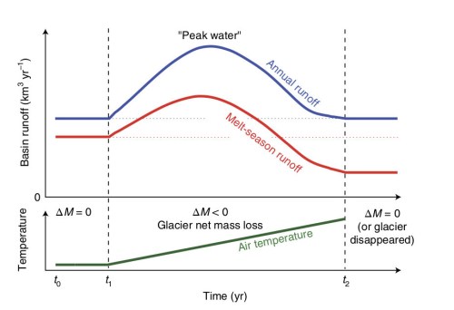 Stroomgebieden van gletsjerrivieren beslaan ruim een kwart van al het landoppervlak op aarde, buiten Groenland en Antarctica. In die gebieden woont bijna een derde van de wereldbevolking. Smeltwater van gletsjers voorziet in die gebieden in meer of mindere mate in de waterbehoefte van mens en natuur. Niet overal is de bijdrage van smeltwater substantieel, maar in sommige gebieden is dat wel het geval. Dat is vooral zo omdat gletsjers juist smelten in warme (en vaak droge) seizoenen. Gletsjers fungeren dan dus als waterbuffers, die juist water leveren in seizoenen met weinig regen en veel verdamping. Als gletsjers geheel of gedeeltelijk verdwijnen door opwarming van het klimaat heeft dat invloed op die buffer-functie. De afbeelding hieronder laat, op een sterk vereenvoudigde en schematische manier, zien hoe dat werkt op de lange termijn. De afbeelding komt uit een recent artikel uit Nature Climate Change: “Global-scale hydrological response to future glacier mass loss” van Mattias Huss en Regine Hock.