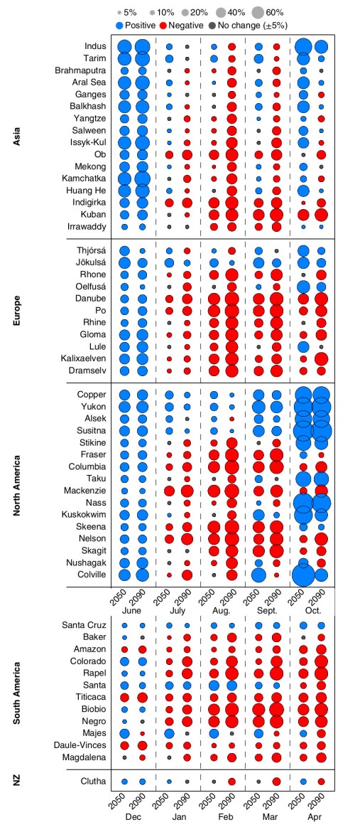 Zoals gezegd werken gletsjers als waterbuffer. Als die bufferende werking verdwijnt zal de afstroom van gletsjerrivieren afnemen in het smeltseizoen. Vaak zal dat vooral in de tweede helft van de zomer zijn. De afbeelding hieronder laat zien wat dit onderzoek verwacht in alle 56 onderzochte stroomgebieden. De onderzoekers hebben gemiddelden over 20 jaar berekend voor emissiescenario RCP4.5. De gekleurde stippen geven de verwachte verandering per maand in de zomer en het najaar weer voor de periode 2040 – 2060 en 2080 – 2100 ten opzichte van het gemiddelde over 1990 – 2010.