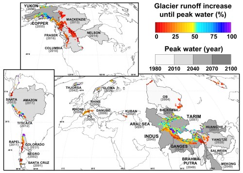 De 56 belangrijkste stroomgebieden van gletsjerrivieren. In kleur wordt de verwachte toename van afstroom door massaverlies van gletsjers weergegeven. Grijstinten geven de periode van maximale afstroom weer in een stroomgebied. Projecties zijn gebaseerd op emissiescenario RCP4.5. (Bron: Huss & Hock 2018, supplementary information)