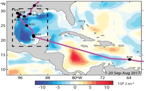De temperatuur van het oceaanoppervlak geeft een goede eerste indicatie van hoeveel energie er beschikbaar is voor een orkaan. Pas vanaf een temperatuur van zo’n 26°C ontstaan er orkanen. Hoe meer de temperatuur daar boven ligt, hoe groter de kans op een zware orkaan. Maar orkanen halen hun energie niet alleen uit het bovenste laagje zeewater. Het water wordt door een orkaan flink omgewoeld, tot een diepte van zo’n 160 meter. De warmte-inhoud van de bovenste 160 meter bepaalt daarom in belangrijke mate hoeveel energie een orkaan uit de oceaan kan halen. En een analyse van die warmte-inhoud voor en na de orkaan geeft een beeld van de hoeveelheid energie die de orkaan heeft opgenomen. Volgens Trenberth et al. is zo’n analyse voor Harvey vrij goed uit te voeren, omdat er in de betreffende periode weinig andere oorzaken waren die voor een verandering van de warmte-inhoud van het water in de Golf van Mexico konden zorgen. Het verschil in warmte-inhoud voor en na Harvey is in de afbeelding hieronder in beeld gebracht.