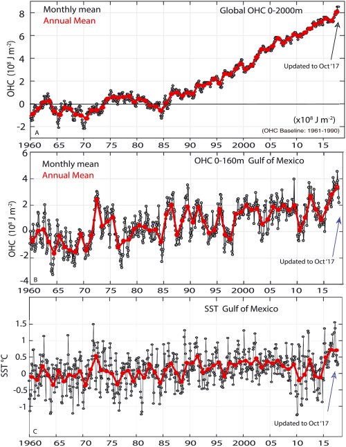 Toename van de warmte-inhoud van de bovenste 2000 meter van de oceanen op mondiale schaal (boven) en de bovenste 160 meter in de Golf van Mexico (midden) en van de temperatuur van het zeeoppervlak in de Golf van Mexico (onder). Bron: Trenberth et al. 2018