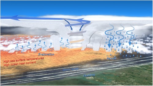 Die schattingen van de extra hoeveelheid lijken erg hoog. Want de hoeveelheid waterdamp die de atmosfeer kan bevatten is door de opwarming in de afgelopen halve eeuw maar met zo’n 5% toegenomen. Dat de hoeveelheid neerslag veel meer toeneemt, komt omdat verdamping en condensatie van water ook voor de energievoorziening van een orkaan zorgen. Meer verdamping zorgt daarom ook voor meer circulatie en mogelijk voor een toename van de diameter van de orkaan. Er verdampt dus meer water uit de oceaan, de sterkere circulatie voert de waterdamp sneller af en het oppervlak waarover dat gebeurt kan ook toenemen. En al dat verdampte water komt ergens weer als neerslag naar beneden.
