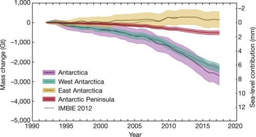 Het artikel dat de meeste aandacht trok komt van de Ice sheet Mass Balance Inter-comparison Exercise (IMBIE), een internationale samenwerking ondersteund door ESA en NASA. Het artikel presenteert een massabalans van de Antarctische ijskap over de periode 1992 – 2017. Het team van IMBIE heeft de resultaten van al het onderzoek dat hierover de afgelopen jaren is gepubliceerd bij elkaar gebracht: gravimetrie en altimetrie met satellieten, metingen van de stroomsnelheid van het ijs, meteorologische heranalyses en andere data over sneeuwval en ijssmelt en analyses van bewegingen van de bodem door postglaciale opheffing, bijvoorbeeld. Dat de ijskap massa verliest was al bekend, maar de snelheid waarmee dat gebeurt blijkt aanzienlijk te zijn toegenomen. Dat heeft een aantal van de betrokken onderzoekers wel verrast. Het logische gevolg is dat de bijdrage van Antarctica aan de snelheid waarmee de zeespiegel stijgt ook toeneemt. De afbeelding hieronder geeft het totale massaverlies weer en de bijdrage daaraan van het Antarctisch Schiereiland, West-Antarctica en Oost-Antarctica.