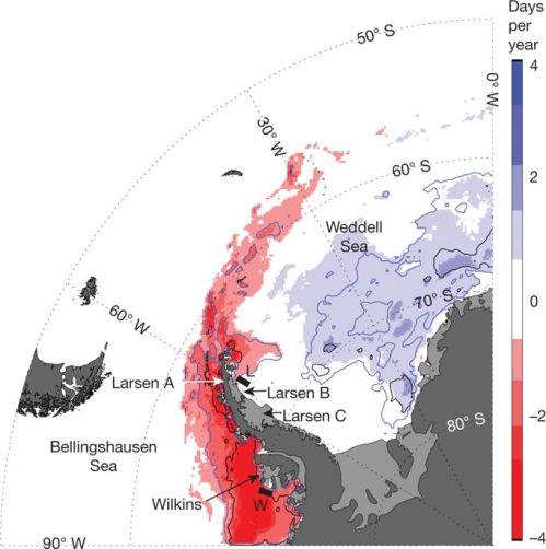 Trend in aantal dagen met zeeijs bij het Antarctisch Schiereiland over de periode 1979/1980 – 2009/2010. Bron: Massom et al.