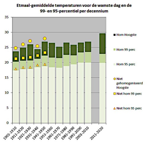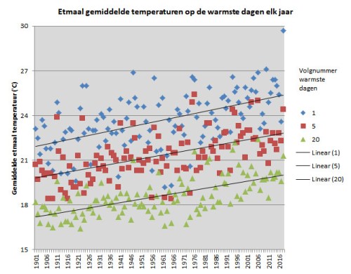 In de figuur wordt de over het etmaalgemiddelde temperatuur voor de warmste, de vijfde en twintigste warmste dag van elk jaar weergegeven. Ondanks de zeer grote variatie van jaar tot jaar, laten de lineaire regressielijnen voor deze punten een duidelijke stijging zien. In het begin van de twintigste eeuw waren de etmaaltemperaturen op deze dagen rond 17, 20 en 22 °C, terwijl zij nu respectievelijk 20, 23 en 25 °C lijken te zijn. We zien ruwweg dezelfde stijging terug als we de analyse niet per jaar, maar per decennium uitvoeren. Ter vergelijking zijn hier ook de niet-gehomogeniseerde waarden gegeven, waarvoor KNMI dus geen overeenkomstige metingen ná 1950 beschikbaar heeft.