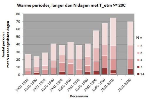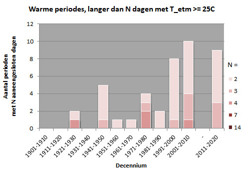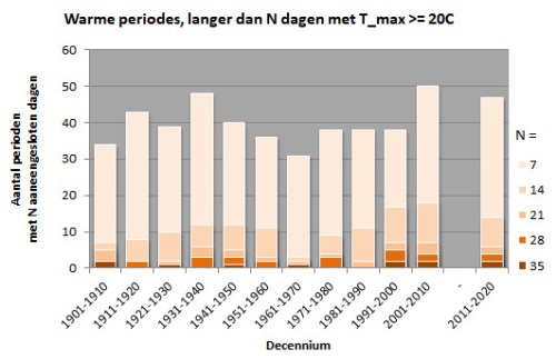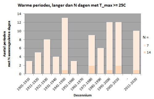 Met name de frequentie van warme perioden met meer dan een paar etmalen lang een gemiddelde temperatuur boven 20 of 25 graden neemt duidelijk toe. De eerst is ruwweg verdubbeld in een eeuw tijd, terwijl de laatste begin 20e eeuw helemaal niet voorkwamen en begin 21e eeuw ongeveer eenmaal per jaar. Het beeld voor periodes met een maximale etmaaltemperatuur boven 20 of 25 graden is minder duidelijk.