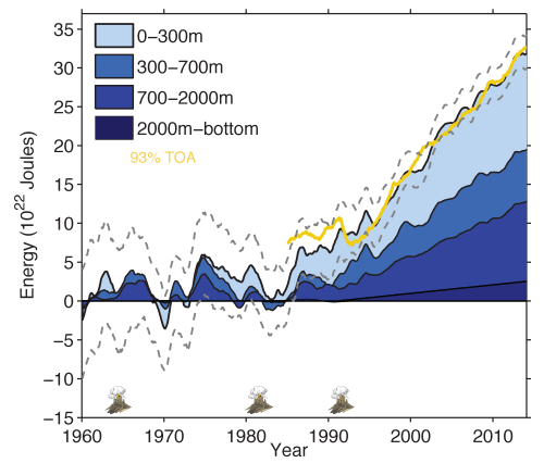 Interne variabiliteit van het klimaat (zoals El Niño) is verplaatsing van energie binnen het klimaatsysteem. Meestal tussen oceaan en atmosfeer. Maar interne variabiliteit kan geen energie uit het niets laten ontstaan. Dus als de atmosfeer op zou warmen door interne variabiliteit, zou het ergens anders in het klimaatsysteem af moeten koelen. In werkelijkheid blijkt de energie-inhoud van het hele klimaatsysteem – en dan vooral de oceanen – toe te nemen. Veel verhalen over cycli berusten op niet meer dan betekenisloos gegoochel met cijfers.