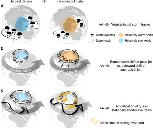 Schematische weergave van verwachte veranderingen in atmosferische circulatie als gevolg van arctische amplificatie. Bron: Coumou et al. 2018