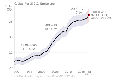 Waartoe hebben al die vuistdikke wetenschappelijke rapporten verschenen in de vier decennia vanaf 1980 geleid, met op grote lijnen steeds weer dezelfde bevindingen? Nou dat is vrij goed te zien aan de jaarlijkse CO2-emissies via de grafiek hieronder. Die zijn toegenomen, toegenomen en nog eens toegenomen. De schatting voor 2018 is dat de hoeveelheid CO2 die wij met zijn allen vorig jaar in de atmosfeer hebben gestort een nieuw record heeft bereikt: circa 37 gigaton. Dat is 37 biljoen kilogram CO2, een 37 met 12 nullen erachter. Een speciaal IPCC-rapport over die anderhalve graad opwarming laat zien dat we alle zeilen bij zouden moeten zetten, willen we als mensheid de opwarming nog beperken tot anderhalve graad of twee graden.