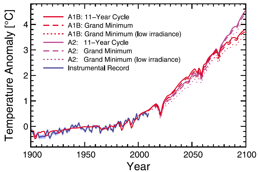 Het effect van een nieuw Grand Mininum in de 21e eeuw op de mondiale temperatuur voor enkele IPCC AR4 scenario’s. Naar fig. 2 uit Feulner & Rahmstorf 2010.