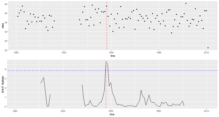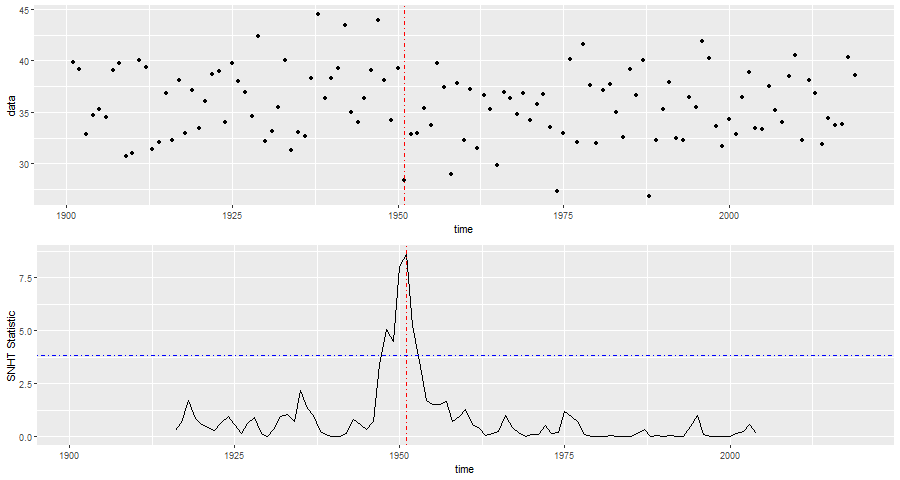 Figuur 1: SNHT uitgevoerd op het jaarlijkse reikwijdte van de Tx van De Bilt. Blauwe stippellijn is de grens voor een breuk met betrouwbaarheidsniveau van 95%.In de ongecorrigeerde meetreeks van De Bilt constateert de breuktest een hoogst significante breuk in 1951 (figuur 1), wat overeenkomt met het moment van de bekende aanpassingen. Hiermee wordt de bruikbaarheid van deze test aangetoond én de noodzaak voor homogenisatie.