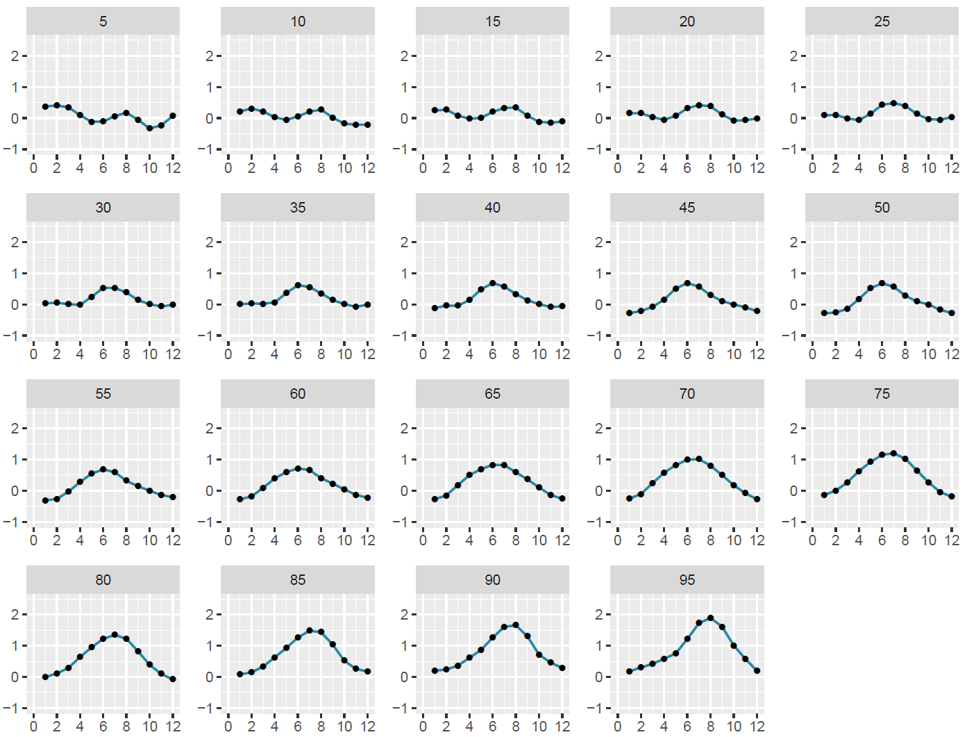 Figuur 2: verschil in temperatuur (verticale as) per maand (horizontale as) tussen de periode voor 1950 en daarna. Elke grafiek toont een percentielwaarde, lopend van 5 (koudste dagen) tot 95 (heetste dagen). Om te homogeniseren wordt in de betreffende maand en voor het gevonden percentiel, de waarde in de grafiek van de oorspronkelijke meting afgetrokken.In bovenstaande figuur is het verschil tussen de oude situatie (voor 1950) en de moderne opstelling weergegeven. Dit is een reproductie van figuur 16 uit de publicatie van Brandsma (2016).