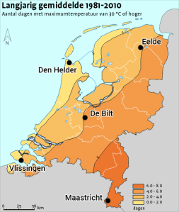 Dat is ook logisch, als je kijkt naar de klimatologische verdeling van hete dagen in Nederland (figuur 3). Die wordt grotendeels bepaald door de afstand tot de Noordzee en terreingesteldheid (grondsoort en hoogte).