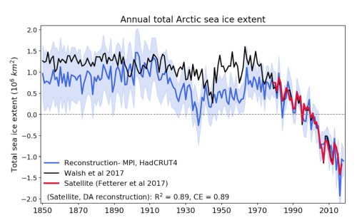 Satellietmetingen van het zee-ijs zijn er pas sinds oktober 1978. Uit de periode daarvoor is er veel minder informatie. Onderzoekers proberen aan de hand van die beperkte informatie de hoeveelheid zee-ijs te reconstrueren. Een nieuw onderzoek, Brennan et al., combineert gegevens uit de al bestaande reconstructies met een data-analyse die gebaseerd is op temperatuurmetingen. Er is een correlatie tussen die temperatuur en het zee-ijs en dat is ook logisch. De temperatuur is immers in belangrijke mate bepalend voor hoeveel ijs er in de herfst en winter bijkomt en hoeveel er in het smeltseizoen weer verdwijnt. Maar een klein deel van het zee-ijs wordt ouder dan enkele jaren, heel anders dan ijs van gletsjers of van de grote ijskappen, dat honderden of zelfs duizenden jaren kan blijven liggen. De reconstructie geeft een indicatie van de verandering sinds 1850. Overigens gaat het hier om het jaargemiddelde en dus niet het minimum. De afbeelding hieronder geeft het resultaat van deze en een eerdere reconstructie, en de satellietdata.
