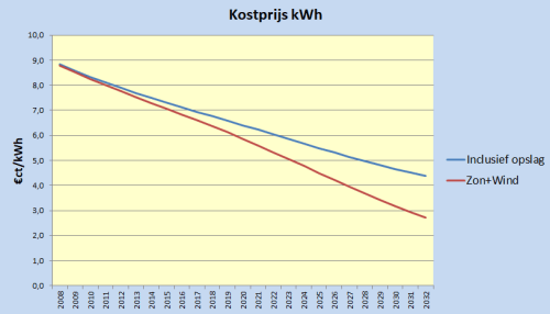 De kosten voor zon en wind dalen door het zogenaamde leereffect. Deze term wordt gebruikt voor de kostprijsdaling (ca. 15%) die optreedt bij iedere verdubbeling van de hoeveelheid geproduceerde producten. Doordat wind en zon nu nog maar een kleine bijdrage in de energievoorziening hebben zullen er nog veel verdubbelingen komen. In dit scenario gaat de kostprijs daarom scherp omlaag. Bij windenergie heeft tot nu toe ook de vergroting van de turbines geholpen om de prijs te verlagen hetgeen overigens ook in de leereffect tot uitdrukking komt.