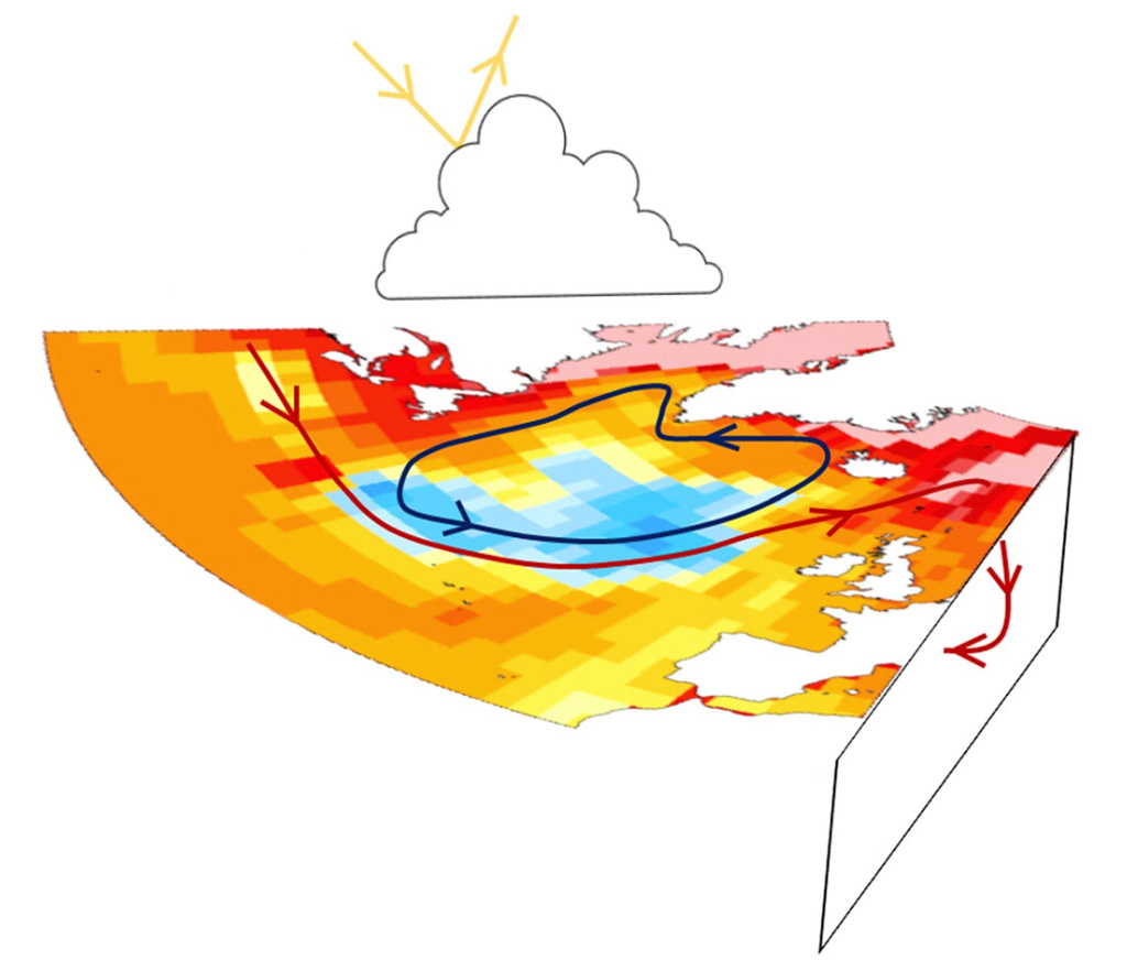 Schematische weergave van de factoren die bijdragen aan de koude vlek: bewolking, minder warmtetransport vanuit het zuiden (rode pijl) en meer warmtetransport naar het noorden (zwarte pijl). Bron: Keil et al.