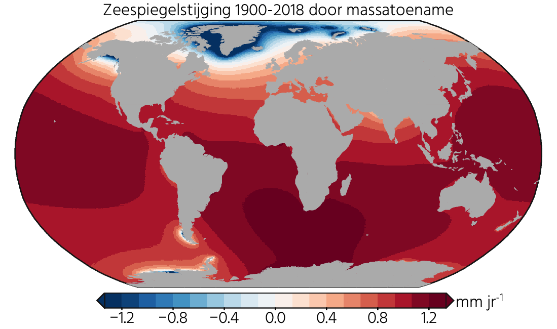 Het goede nieuws van het kloppende sommetje is dat we nu niet meer hoeven te twijfelen dat we geen belangrijke processen die globale zeespiegelstijging hebben veroorzaakt over het hoofd zien. Wanneer we al die processen nauwkeurig kunnen voorspellen kunnen we dus een goede schatting maken van de toekomstige zeespiegelstijging. Hoewel, de toekomst van beide ijskappen nauwkeurig voorspellen is geen sinecure. Wetenschappers discussiëren bijvoorbeeld al jaren over de stabiliteit van West-Antarctica, en daardoor zijn de projecties behoorlijk onzeker [14]. Dat is voor Nederland een groot probleem: het ijs dat gesmolten is in de 20e eeuw komt vooral uit het Arctisch gebied: Groenland, Alaska, Canada, IJsland, Spitsbergen etc. Dankzij allerlei zwaartekrachts- en aardvervormingseffecten stijgt de zeespiegel ver weg van de plaats waar het ijs smelt het hardst. Daarom heeft al dat gesmolten ijs veel minder bijgedragen aan zeespiegelstijging langs de Nederlandse kust dan het wereldwijd gemiddelde (Zie Figuur 3). Desondanks stijgt de zeespiegel in Nederland ongeveer even snel als het wereldwijd gemiddelde, maar dat komt door andere processen: hier is de zeespiegel vooral gestegen door de opwarmende Atlantische Oceaan en omdat de Nederlandse bodem als gevolg van de dikke ijskap die hier tijdens het laatste glaciaal lag nog steeds aan het zakken is. Een peilmeetstation registreert zo’n verzakking als een zeespiegelstijging. Als Antarctica veel massa gaat verliezen, dan krijgen wij hier juist wel de volle laag van. Hoe snel de zeespiegel daardoor gaat stijgen is dus nog niet helemaal duidelijk. Des te meer redenen om onze uitstoot snel terug te dringen en om zo snel mogelijk uit te zoeken hoe stabiel West-Antarctica nou precies is!