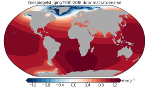 Figuur 3. Wereldwijde zeespiegelstijging in mm per jaar sinds 1900 door het smelten van ijs en veranderingen in de hoeveelheid vloeibaar water op land. In de Noordzee is de zeespiegel hierdoor maar half zo snel gestegen als het wereldwijd gemiddelde.