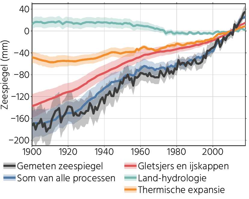 Figuur 2. Gemeten globale zeespiegelstijging sinds 1900 en de processen die dat hebben veroorzaakt. Alle hoogtes zijn ten opzichte van het gemiddelde over 2000-2018.