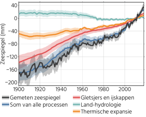 De gemeten zeespiegelstijging sinds 1900 is voor circa twee derde veroorzaakt door smeltend ijs, en dan vooral smeltende gletsjers en in mindere mate de Groenlandse ijskap. Dat beeld verandert vrij dramatisch in de laatste decennia: sinds de jaren 90 begint ook Antarctica veel ijsmassa te verliezen, en de bijdrage van Groenland is sinds die tijd ook ongeveer even groot als de gletsjerbijdrage. Een recente studie liet zelfs zien dat in 2019 het ijsmassaverlies in Groenland een zeespiegelstijging van 1.5 mm heeft veroorzaakt [12]: dat is dus even veel als de gemiddelde zeespiegelstijging sinds 1900, maar veroorzaakt door slechts een ijskap! Ook kun je zien aan het oranje lijntje dat de opwarming van de oceanen steeds sneller gaat.