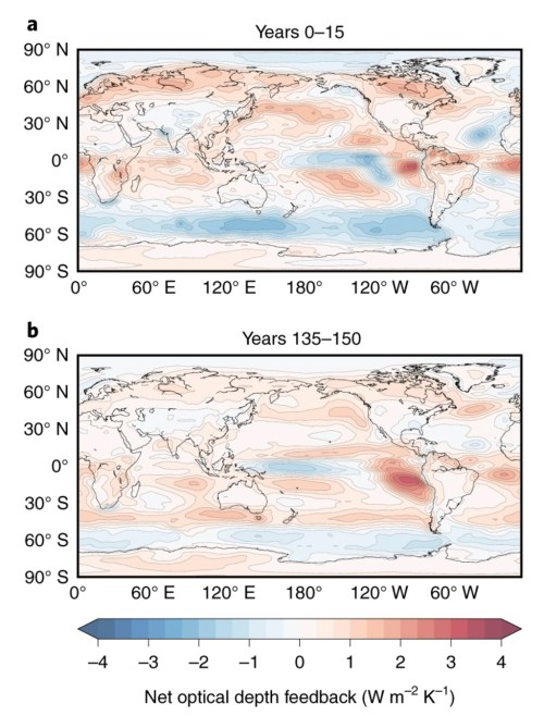 De afbeelding hieronder laat zien hoe de witheid van de bewolking, ofwel de optische dikte, volgens dit onderzoek verandert als het klimaat opwarmt. Een verandering in de verhouding tussen ijs en vloeibaar water is niet de enige factor die invloed heeft. Ook de totale hoeveelheid water en de druppelgrootteverdeling spelen bijvoorbeeld een rol. In de afbeelding is het gezamenlijke effect van die factoren te zien. Het model heeft gerekend met een instantane verviervoudiging van de CO₂-concentratie. In het bovenste deel is de verandering in de eerste vijftien jaar van een simulatie over anderhalve eeuw weergegeven, in het onderste deel die over de laatste 15 jaar. Het verschil boven de Zuidelijke Oceaan is duidelijk zichtbaar. In eerste instantie, als de opwarming nog maar net is begonnen, remt de optische dikte van de wolken de opwarming daar aanzienlijk af. Maar later is er van die afremming niet zoveel meer over.
