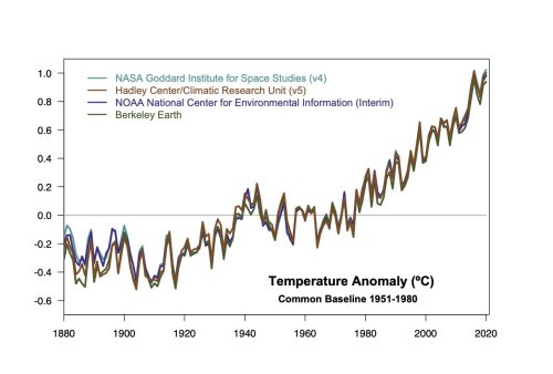 Een relevant plaatje aan het begin van het nieuwe kalenderjaar is natuurlijk een overzicht van de mondiaal gemiddelde temperatuur. Deze komt van klimaatwetenschapper Gavin Schmidt. De verschillende reconstructies liggen vrij dicht bij elkaar, nu ook NOAA het Arctische gebied mee neemt middels ruimtelijke interpolatie. Aangezien het noordpoolgebied sterker opwarmt dan het mondiaal gemiddelde is dat belangrijk om een bias in de temperatuurreeks te voorkomen.